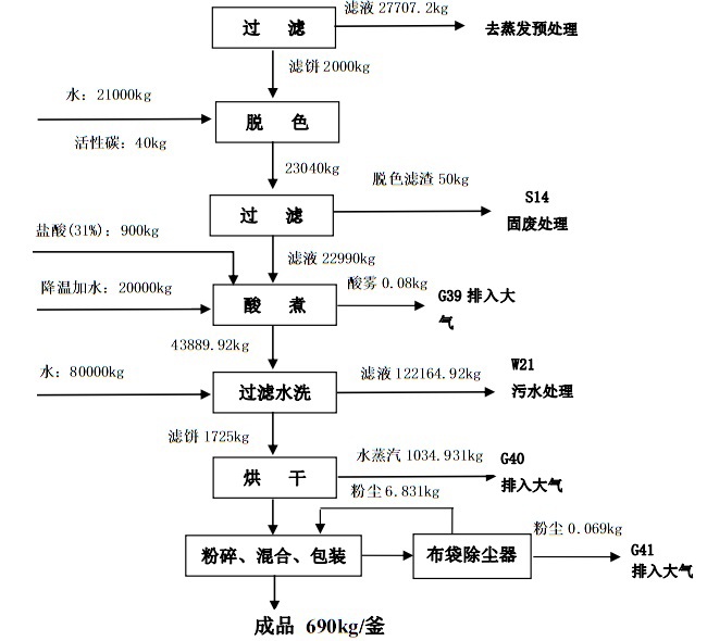 Add the measured water and hydrochloric acid into the pulping kettle. Under stirring, the dried materials were heated to 60℃ and maintained for 2 hours, resulting in a yield of 94.9%. After the heat preservation time is up, the materials are placed in the suction filter tank, washed with hot water until neutral (the washing wastewater is sent to sewage treatment), then drained, sent to the oven for drying, crushed, packaged and stored in the warehouse. The water vapor generated during the drying process is directly discharged into the atmosphere. The dust produced after crushing is treated by a bag filter and then discharged into the atmosphere. The recovered dust is mixed into the finished product, with a total recovery rate of 66.8%.