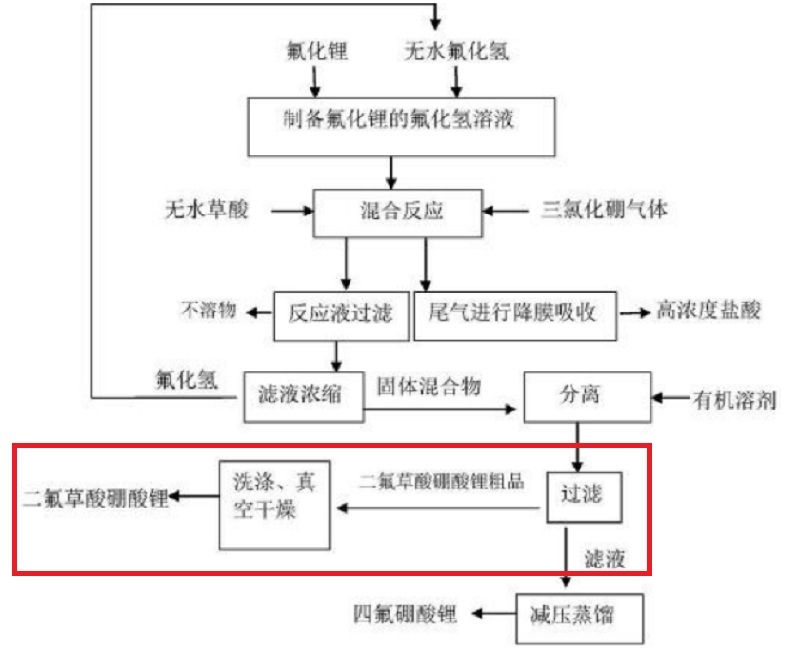 Due to the poor chemical stability of lithium hexafluorophosphate, it decomposes significantly when the temperature is above 55℃ or when LiPF6 comes into contact with protic solvents (such as water, alcohols, etc.), generating impurities such as phosphorus pentafluoride (PF5), phosphorus trifluoride (OPF3), and hydrogen fluoride (HF), which are highly destructive to the electrolyte and electrode materials. This is an important reason for the shortened service life of batteries and also the root cause of battery safety issues. Therefore, the development of conductive lithium salts with superior chemical and electrochemical stability has been a goal that both the academic and industrial communities have been tirelessly pursuing over the past two decades. Among them, the derivative of LiBF4, lithium difluoroxalate borate, due to its excellent chemical and electrochemical stability, significant passivation of Al current collectors at high potentials, and direct participation in the formation of the SEI film on the negative electrode surface, etc. It is regarded as one of the most promising new lithium salts to replace LiPF6, or can be used as an auxiliary salt in combination with LiPF6. Research shows that the chemical structure of LiDFOB lies between that of LiBOB and LiBF4, combining the advantages of lithium bis oxalate borate and lithium tetrafluoroborate. Its thermal decomposition temperature is as high as 240℃, and it has a relatively high solubility in carbonate solvents. Meanwhile, its relatively flexible chemical structure is conducive to reducing the viscosity of the electrolyte. Lithium difluoroxalate borate has good compatibility with graphite electrodes. The SEI film it participates in forming can maintain good stability at high temperatures. Therefore, lithium difluoroxalate borate simultaneously possesses the high-temperature performance of LiBOB and the low-temperature characteristics of LiBF4.
