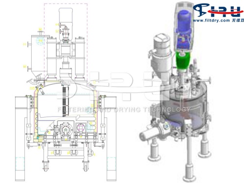 A transmission device is installed on the top of the tank, and the rotational speed, forward rotation or reverse rotation is controlled by a variable frequency motor. The tank is equipped with a stirring paddle that is hydraulically controlled for lifting and lowering. The stirring shaft and the stirring paddle can be made into a hollow structure, and a heat medium can be introduced to enhance heat transfer during drying. The tank is horizontally equipped with filter plates - filter beds, which divide the tank into upper and lower compartments. Materials and inert gases are added to the upper compartment, while the lower compartment is evacuated to create a pressure difference between the top and bottom, thereby accelerating the filtration rate. There are heating (cooling) jackets or coils on the outside of the tank and under the filter plate. A discharge port is provided at the lower side of the upper compartment, which is connected to a plug type discharge valve. The bottom of the tank - the chassis can be raised and lowered by hydraulic control during disassembly.