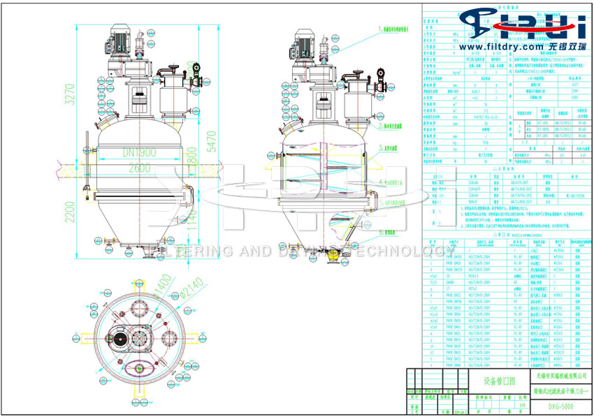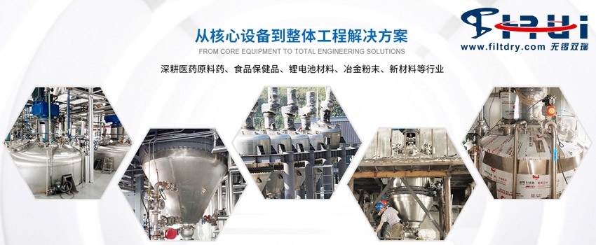 The conical three-in-one filtration, washing and drying system has many advantages. It can complete various operations such as reaction, extraction, crystallization, filtration, washing, repeated washing, filtration and drying in a fully enclosed state within one device, thus significantly shortening the process flow and greatly saving investment in factory buildings, floor space, equipment, process pipelines, valves, etc. It is particularly suitable for processing flammable, explosive, toxic or highly toxic materials, or materials that are harmful to the human body, as well as fresh and delicious foods, biological products, medicines, etc. that are not allowed to be contaminated. This machine can conveniently and directly obtain finished products in a fully enclosed state within one device. It not only avoids the trouble caused by the connection and material transportation among several separate unit devices such as reaction, filtration, washing and drying, but also reduces the loss and waste of materials to zero.