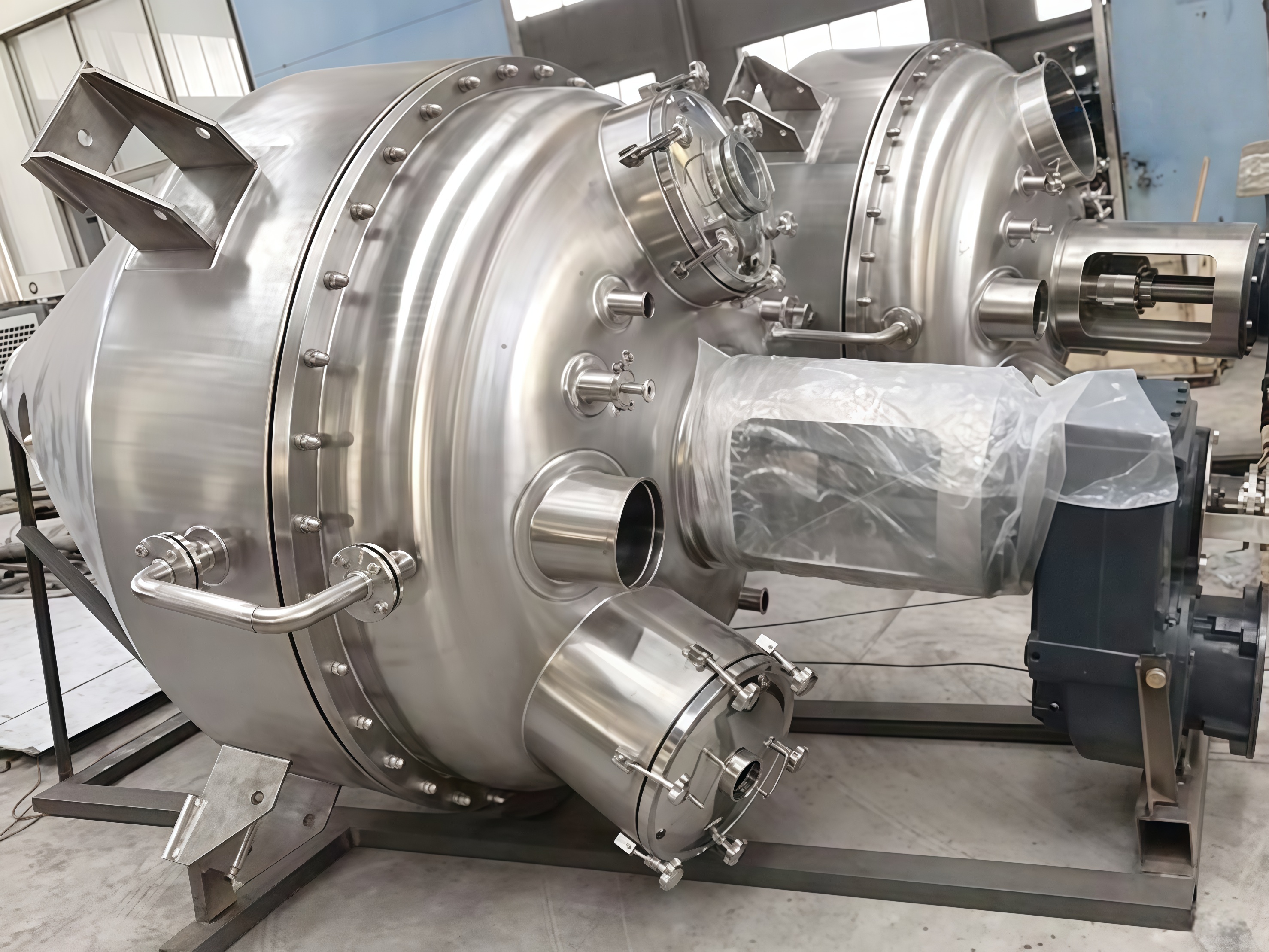 (2) Cylinder: The cylinder consists of a head and a conical cylinder. The head and the cylinder are heated and insulated by jackets, and necessary manholes, process pipe openings and sight glasses are provided. It is equipped with a stirrer shaft seal, a bottom discharge valve, an upper feed valve and a dust filter.