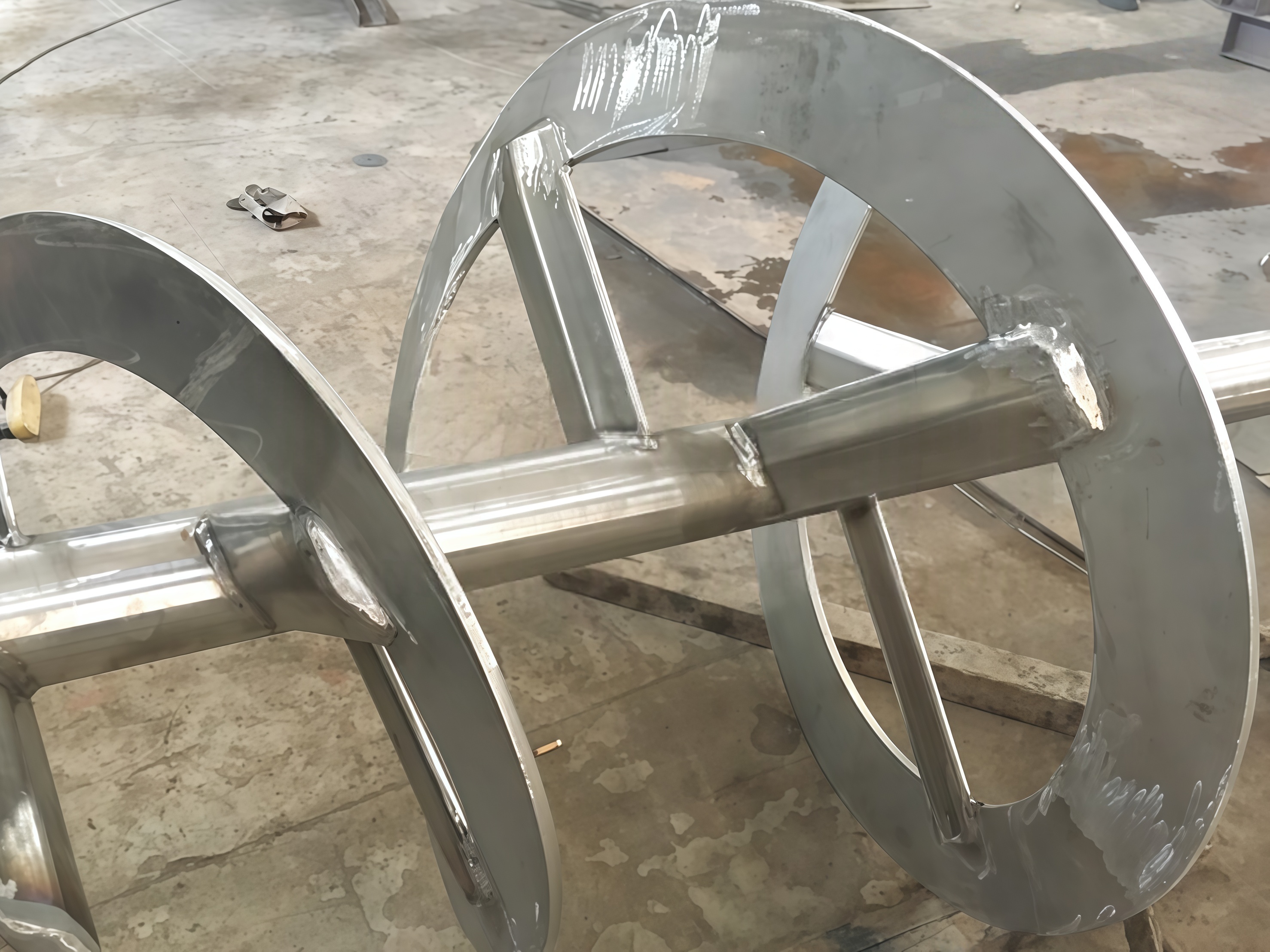 The solid-liquid mixture slurry produced by the upstream reaction vessel or crystallization equipment is fed into the tank of the two-in-one equipment. Open the filtrate outlet at the bottom and introduce compressed air or nitrogen and other gases into the equipment to pressurize and filter the solid-liquid mixture that has undergone the reaction until the material inside the machine is dried. Vacuum can also be drawn at the filtrate outlet to perform vacuum filtration on the material until the filtrate is completely drained. During filtration, the hollow shaft and hollow screw ribbon can be rotated clockwise (viewed from the top down) to lift the material. At the same time, the hollow screw ribbon can limit the thickness of the filter cake layer while rotating, allowing the material to be filtered under the condition of a thin filter cake layer, thereby increasing the filtration rate. For materials that are easy to filter, there is no need to stir during filtration; just filter the materials dry directly.
