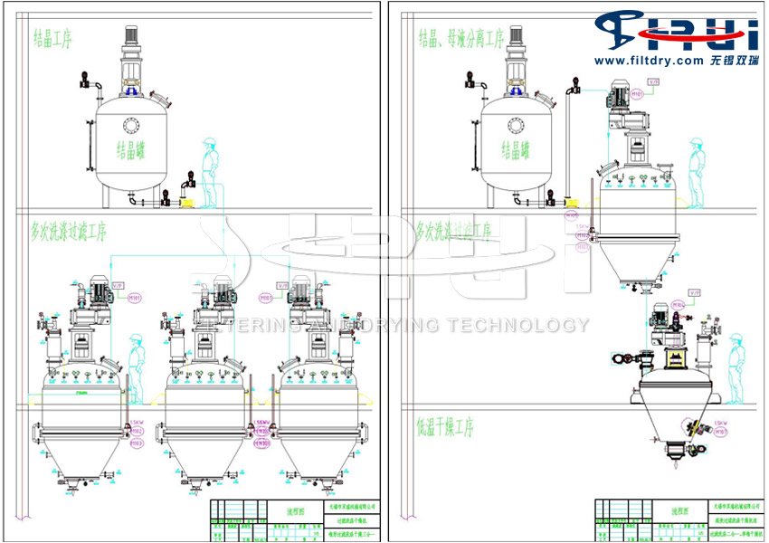 d-α-tocopherol and succinic acid are esterified, recrystallized, filtered by centrifugation, crushed, and dried to prepare synthetic vitamins. The original process used a centrifuge for filtration and washing, and the filter cake was crushed by a swing granulator and then dried in a fluidized bed dryer. Due to the use of organic solvents in the production of synthetic vitamins, there are certain safety and occupational health risks. The traditional process equipment is batch production, with high labor intensity for employees. There is an urgent need to improve production conditions and reduce safety risks. This process has the following disadvantages: