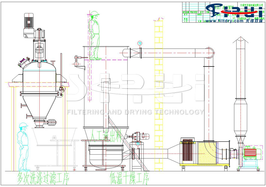 To address the issues of unsatisfactory heat transfer effect and low drying efficiency when the filter-wash-dry integrated machine dries some thermosensitive and thixotropic crystalline materials, Wuxi Shuangrui has developed the Thermosensitive Material Refining, Purification, Filtration, Washing and Drying Unit (Patent No.: ZL 202120867061.3). Its characteristics are as follows: it includes a crystallization tank, a conical filter-wash dual-purpose machine, and a fluidized bed dryer. The crystallization tank is connected to the conical filter-wash dual-purpose machine via pipelines, and a chemical pump is installed on the pipeline between the crystallization tank and the conical filter-wash dual-purpose machine. The fluidized bed dryer is located below the conical filter-wash dual-purpose machine and connected to it through pipelines. The fluidized bed dryer comprises a straight-section dust removal box and a silo. A pulse bag dust cleaning device is arranged above the inside of the straight-section dust removal box, and a main machine air outlet is provided above the pulse bag dust cleaning device. The main machine air outlet is connected to an induced draft fan via a pipeline, and the induced draft fan is connected to an external tail gas treatment device through a pipeline. A wet material inlet is arranged above the bottom of the straight-section dust removal box, and the wet material inlet is connected to the wet material outlet below the conical filter-wash dual-purpose machine via a pipeline. The silo is installed at the bottom of the straight-section dust removal box, and the silo includes a mixing bin and an air distribution chamber. A hot air distribution plate is arranged between the mixing bin and the air distribution chamber. A stirring mechanism is installed in the middle of the mixing bin and located above the hot air distribution plate. An air inlet is provided on the side of the air distribution chamber, and the air inlet is connected to a hot air heating box via a pipeline. A discharge port is arranged at the lower cylinder of the air distribution chamber.